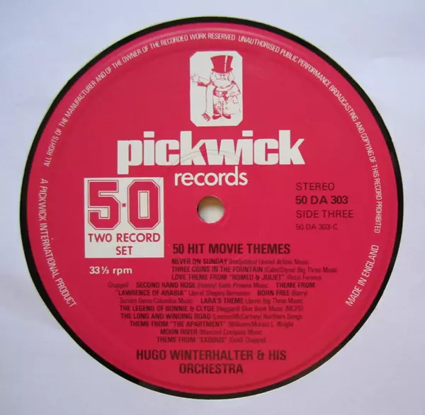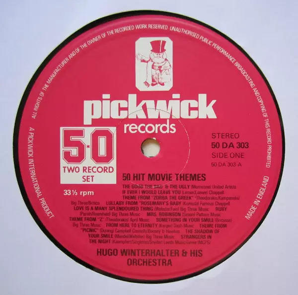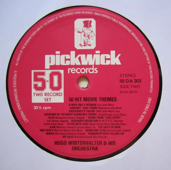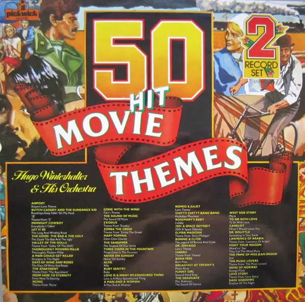 Hugo Winterhalter Orchestra: 50 Hit Movie Themes (2xLP) versión en vinilo 2LP en estándar edición. Esta edición en concreto se lanzó en Reino Unido en la editorial Pickwick Records del año 1977. Álbum abarca todos los géneros Escenario y pantalla y Theme. Gatefold Vinyl.