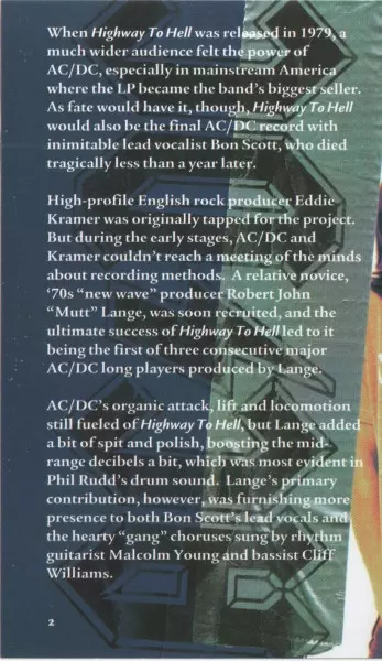 Highway to Hell" je jedním z nejlepších alb AC/DC - a samozřejmě jedním z nejlepších alb hard rocku. Jako první platinové album skupiny v Americe upevnilo její pověst velkých hvězd a připravilo půdu pro naprostou světovou dominanci v následujících letech. To vše se stalo navzdory tragickému úmrtí zpěváka Bona Scotta necelý rok po vydání "Highway...