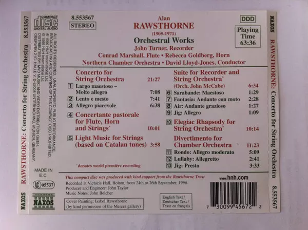 | Artista | David Lloyd-Jones | Alan Rawsthorne | Northern Chamber Orchestra | John Turner | Conrad Marshall | Rebecca Goldberg |