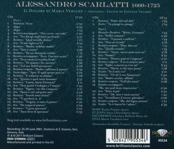Alessandro Scarlatti: Il Dolore di Maria Vergine versión en 2CD en estándar edición. Esta edición en concreto se lanzó en Europa en la editorial Brilliant Classics el día 1. diciembre 2017. Álbum abarca todos los géneros Música clásica, Música barroca y Oratorio.