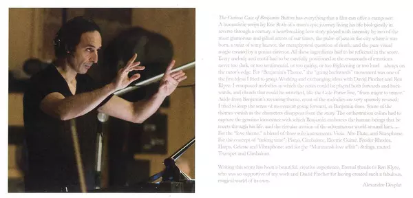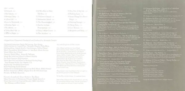 The soundtrack to David Fincher's (Zodiac, Fight Club) new film, which received 8 nominations at the American Film Critics Awards, making it one of the most anticipated films of this year's Oscar season. It is a truly wondrous story of a man who was born an old man and slowly became a young man. It stars Brad Pitt as Cate Blanchett. The soundtrack was written, composed and conducted by Alexandre Desplat. The soundtrack is released on 2 CDs, the first featuring Desplat's original music and the second featuring jazz classics performed by Bix Beiderbecke, The Boswell Sisters, Preservation Hall Jazz Band, Louis Armstrong, Sidney Bechet, Perez Prado, The Platters...