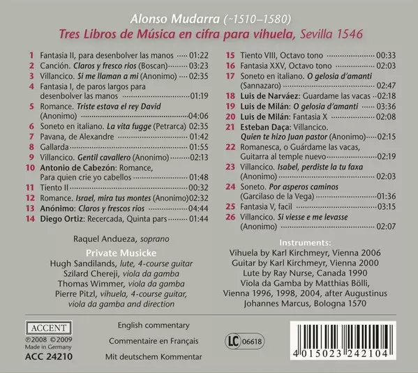 | Artista | Raquel Andueza | Private Musicke | Alonso Mudarra |