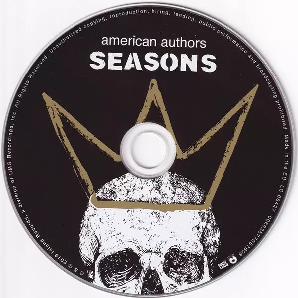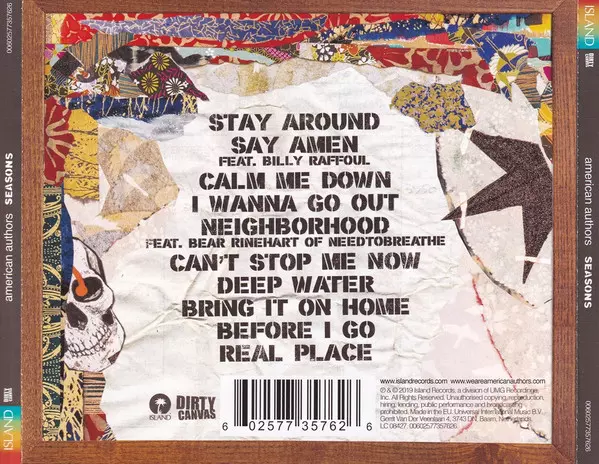 American Authors: Seasons versión en CD en estándar edición. Esta edición en concreto se lanzó en Europa en la editorial Island Records en colaboración con Dirty Canvas (2) el día 1. febrero 2019. Álbum abarca todos los géneros Rock, Pop y Indie Rock.