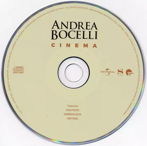 Andrea Bocelli: Cinema versión en CD en estándar edición. Esta edición en concreto se lanzó en Europa en la editorial Sugar (2) en colaboración con Almud y Universal el día 23. octubre 2015.