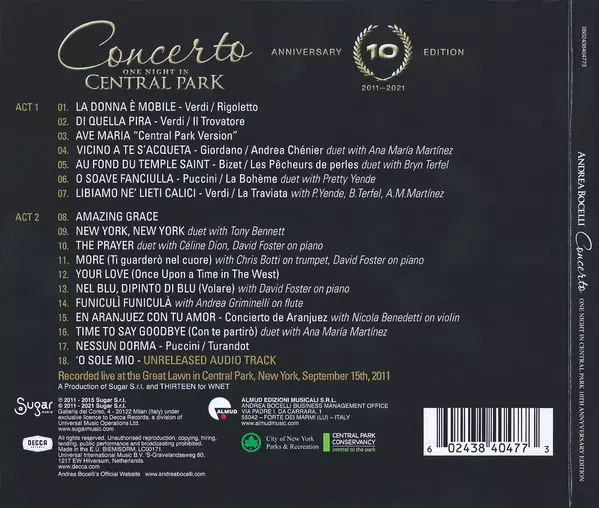 Andrea Bocelli, one of the most famous singers of all time, presents a special reworking of his Concerto album: One Night in Central Park capturing the graceful yet raw nature of the live album, which was lovingly recorded in New York City on September 15, 2011. It also features exceptional new performances, including a brand new recording of O Sole Mio