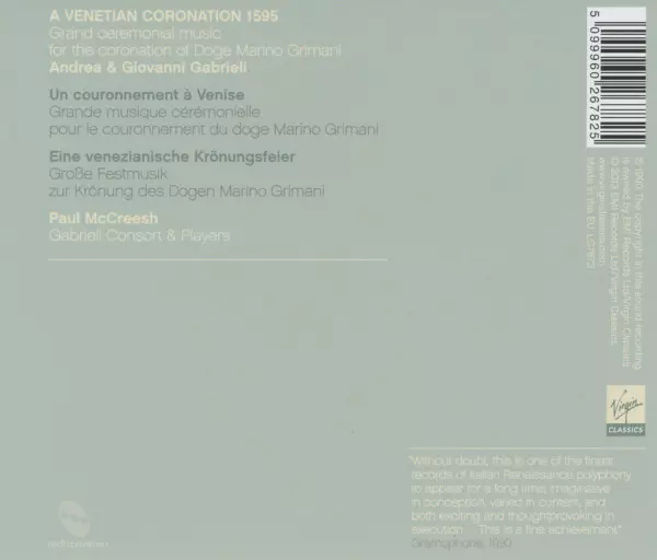 Andrea Gabrieli: A Venetian Coronation 1595 versión en CD en estándar edición. Esta edición en concreto se lanzó en Europa en la editorial Virgin Classics del año 2013. Álbum abarca todos los géneros Música clásica, Música barroca y Renaissance.