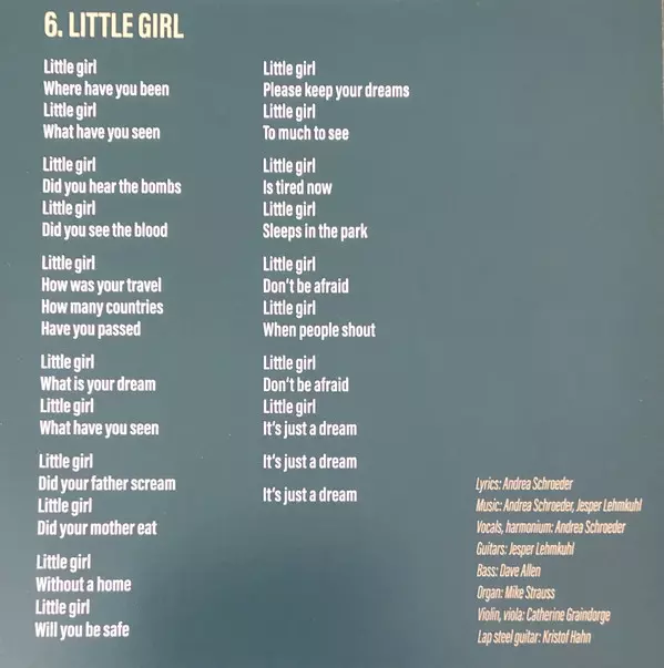 Bass Dave Allen (24) | Drums Maurizio Vitale | Electric Guitar Pelle Ossler | Lap Steel Guitar Kristof Hahn | Music By, Electric Guitar Jesper Lehmkuhl | Piano Mike Strauß | Vocals, Music By, Lyrics By Andrea Schroeder