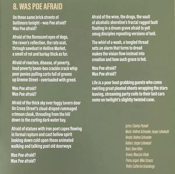 Bass Dave Allen (24) | Drums Maurizio Vitale | Lyrics By Charles Plymell | Music By, Guitar Jesper Lehmkuhl | Piano, Organ Mike Strauß | Violin Catherine Graindorge | Vocals, Music By Andrea Schroeder