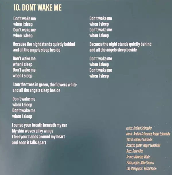 Bass Dave Allen (24) | Drums Maurizio Vitale | Effects Ulf Ivarsson | Lyrics By, Vocals, Music By Andrea Schroeder | Music By, Guitar Jesper Lehmkuhl | Piano Mike Strauß | Viola, Violin Catherine Graindorge
