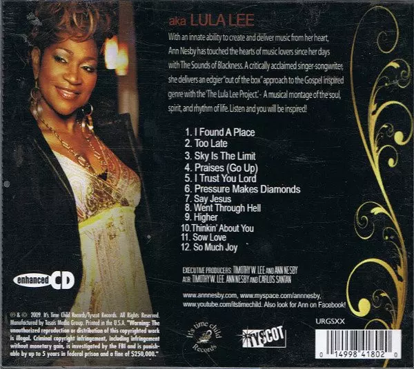 Ann Nesby: The Lula Lee Project versión en CD en estándar edición. Esta edición en concreto se lanzó en EE.UU. en la editorial It's Time Child Records en colaboración con Tyscot Records el día 31. marzo 2009. Álbum abarca todos los géneros Música electrónica, Funk / Soul, House, Soul y Gospel.