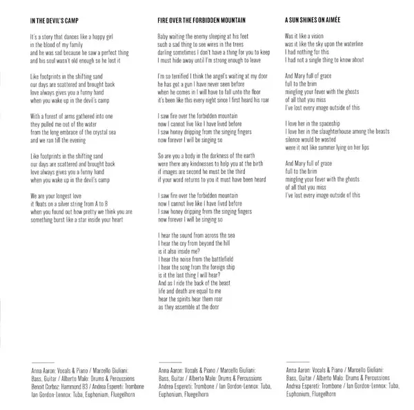 Bass, Guitar Marcello Giuliani | Drums, Percussion Alberto Malo | Electric Organ [Hammond B3] Benoît Corboz | Trombone Andrea Esperti | Tuba, Euphonium, Flugelhorn Ian Gordon-Lennox | Vocals, Piano Anna Aaron