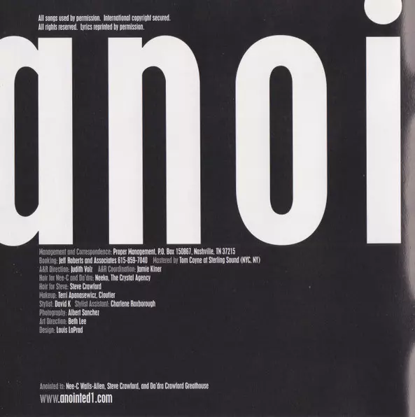 Arranged By [Vocal Arrangements] Anointed, Keith Crouch | Backing Vocals Anointed | Bass, Guitar John "Jubu" Smith | Mixed By Booker T. Jones III | Mixed By [Assisted By] Bill Kinsley | Producer, Arranged By, Drums, Drum Programming Keith Crouch | Recorded By Chris Champion, Keith Crouch, Tom Laune | Recorded By [Assisted By] Anthony Irish | Written-By Anointed, Glenn McKinney, Keith Crouch