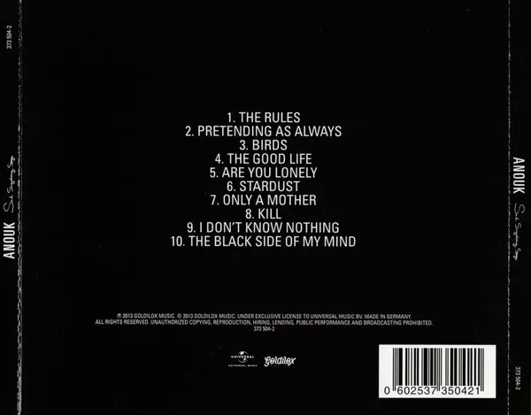 Anouk: Sad Singalong Songs versión en CD en estándar edición. Esta edición en concreto se lanzó en Países Bajos en la editorial Goldilox Music el día 17. mayo 2013. Álbum abarca todos los géneros Pop, Música electrónica, Balad y Trip Hop.