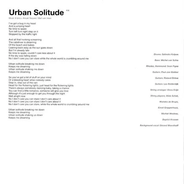 Arranged By [Strings] Onno Krijn | Backing Vocals Dinand Woesthoff | Bass Michel van Schie | Drums Satindra Kalpoe | Guitar Lex Bolderdijk, Paul Jan Bakker, Roland Dirkse | Organ [Hammond], Electric Piano [Rhodes] Sven Figee | Strings Alida Schat, Baptist Knaven, Ernst Grapperhaus, Marieke De Bruijn, Michiel Weidner