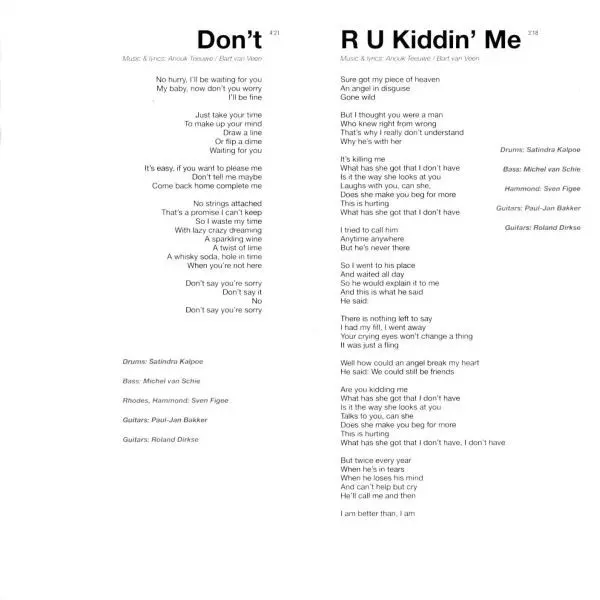 Bass Michel van Schie | Drums Satindra Kalpoe | Guitar Paul Jan Bakker, Roland Dirkse | Piano Sven Figee | Vocals, Music By, Lyrics By Dinand Woesthoff