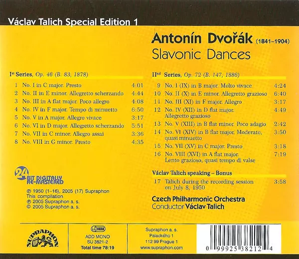 Product information: - The exuberant beginning of a special edition dedicated to the 20th century conducting legend Václav Talich - 16 Slavonic Dances in an extraordinary interpretation by Václav Talich and the Czech Philharmonic Orchestra from a historic Supraphon recording from 1950. - The version that established the performance tradition o...