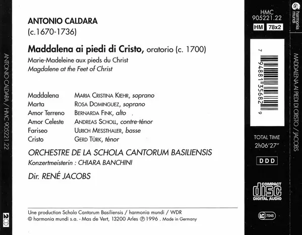 Bernarda Fink: Maddalena Ai Piedi Di Cristo versión en 2CD en estándar edición. Esta edición en concreto se lanzó en Europa en la editorial Harmonia Mundi France en colaboración con Harmonia Mundi el día 23. agosto 1996. Álbum abarca todos los géneros Música clásica, Música barroca y Oratorio.