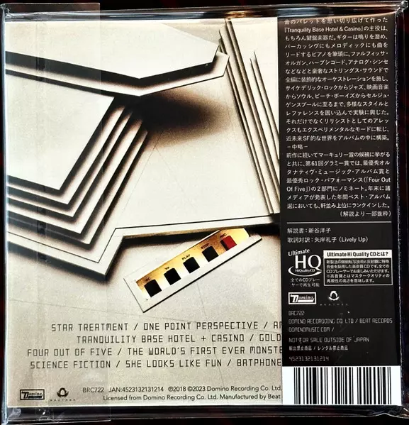 Arctic Monkeys: Tranquility Base Hotel + Casino versión en CD en estándar edición. Esta edición en concreto se lanzó en Japón en la editorial Beat Records en colaboración con Domino el día 24. febrero 2023.