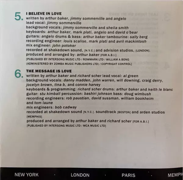 Backing Vocals Jimmy Somerville, Sheila Smith | Drums, Bass Arthur Baker | Engineer [Mix Engineer] John Potoker | Engineer [Recording Engineer] Avril Mackintosh, Louis Scalise, Mark Plati | Featuring Jimmy Somerville | Guitar [Guitars] Angelo (4) | Keyboards Angelo (4), Arthur Baker, David O'Bear, Mark Plati | Lead Vocals Jimmy Somerville | Producer, Arranged By Arthur Baker | Tambourine Sally Ven-Yu Berg | Written-By Angelo (4), Arthur Baker, Jimmy Somerville