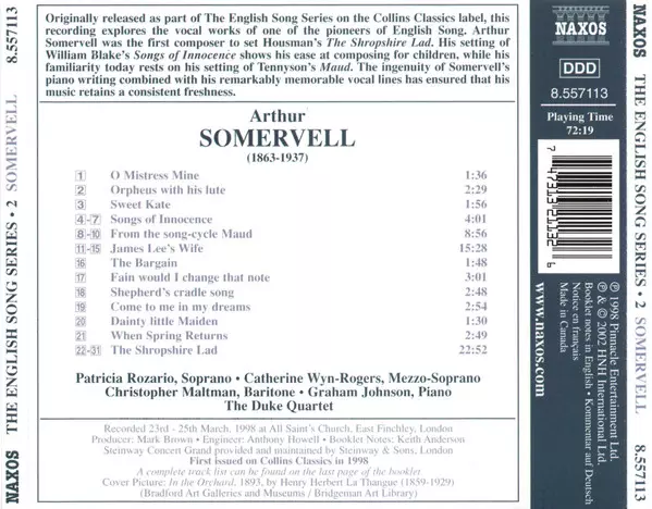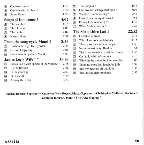 | Artista | Christopher Maltman | Catherine Wyn-Rogers | Graham Johnson | Patricia Rozario | Sir Arthur Somervell | The Duke Quartet |