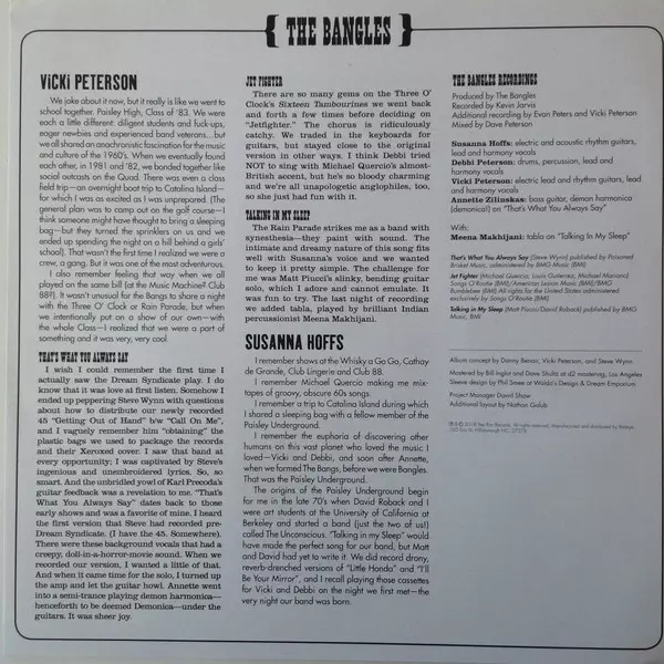 | Bass Guitar, Harmonica [Demon Harmonica] Annette Zilinskas | Drums, Percussion, Harmony Vocals Debbi Peterson | Lead Guitar [Electric], Rhythm Guitar [Electric], Lead Vocals, Harmony Vocals Vicki Peterson | Mixed By Dave Peterson | Producer Bangles | Recorded By Kevin Jarvis (2) | Recorded By [Additional Recording By] Evan Peters, Vicki Peterson | Rhythm Guitar [Electric And Acoustic], Harmony Vocals Susanna Hoffs | Songwriter Steve Wynn | |||
