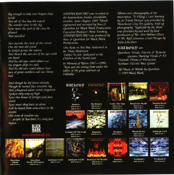 "Hammerheart" je páté album skupiny Bathory. Pokračovalo ve vývoji Blood Fire Death od black metalu směrem k tzv. viking metalu a je považováno za milník v tomto žánru. Bathory byla založena ve Stockholmu v roce 1983. Zakladatele Quorthona, sedmnáctiletého kytaristu, doplnili baskytarista Hanoi a bubeník Vans. Po různých změnách názvu (nejprve ...