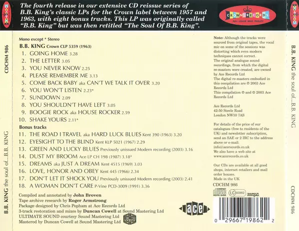 The original, rarely heard LP, which appeared in October 1963 under the title "B. B. King," was the twelfth and final B. B. to be released on Crown. For later reissues of the LP it was renamed The Soul Of B. B. King, a name that reflected the spirit of the times (and was less confusing to record buyers). For the avoidance of doubt, let's say str...