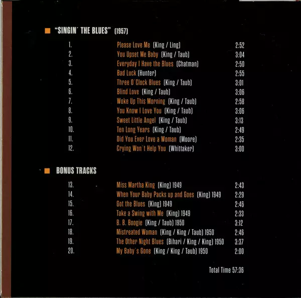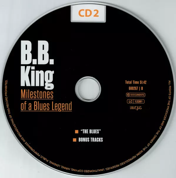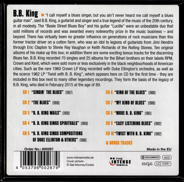 B.B. King: Milestones Of A Blues Legend versión en 10CD/Caja en estándar edición. Esta edición en concreto se lanzó en Europa, EE.UU. y Canadá en la editorial Documents en colaboración con The Intense Media el día 14. diciembre 2018. Álbum abarca todos los géneros Blues, Jazz, Funk / Soul, Electric Blues, Chicago Blues, Gospel, Modern Electric Blues y East Coast Blues.