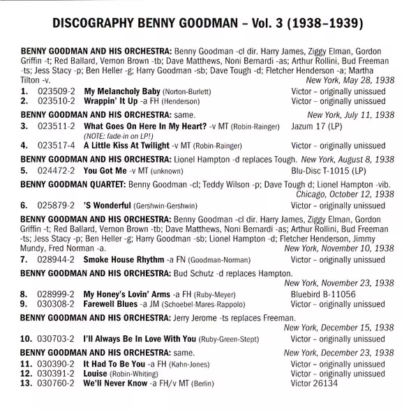 | Alto Saxophone Dave Matthews (2), Noni Bernardi | Arranged By Fletcher Henderson, Fred Norman, Jimmy Mundy | Bass Harry Goodman | Clarinet, Directed By, Leader Benny Goodman | Drums Buddy Schutz | Guitar Ben Heller | Orchestra Benny Goodman And His Orchestra | Piano Jess Stacy | Tenor Saxophone Arthur Rollini, Bud Freeman | Trombone Red Ballard, Vernon Brown | Trumpet Chris Griffin (3), Harry James (2), Ziggy Elman | Written-By Herman Ruby, Joseph Meyer | |||