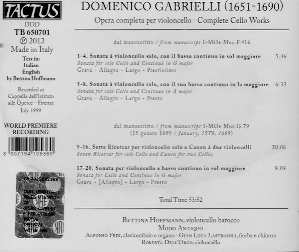 | Artista | Modo Antiquo | Domenico Gabrielli | Bettina Hoffmann |