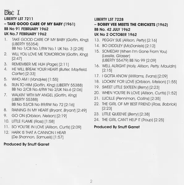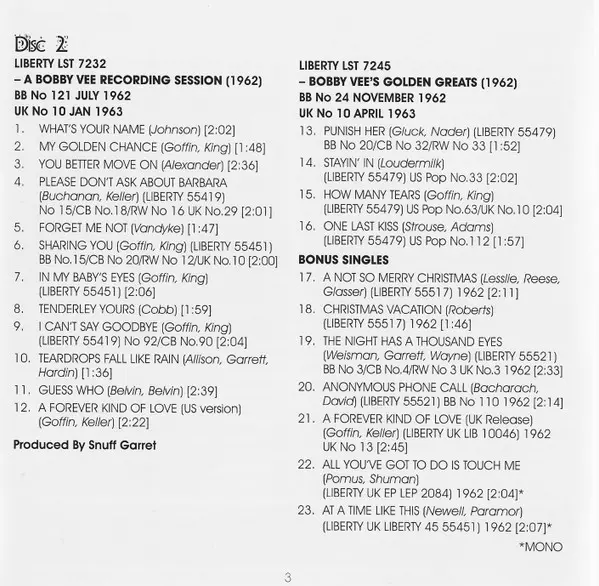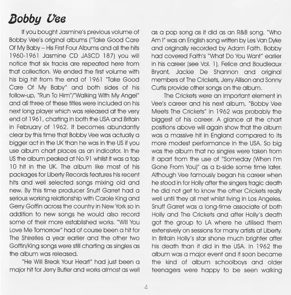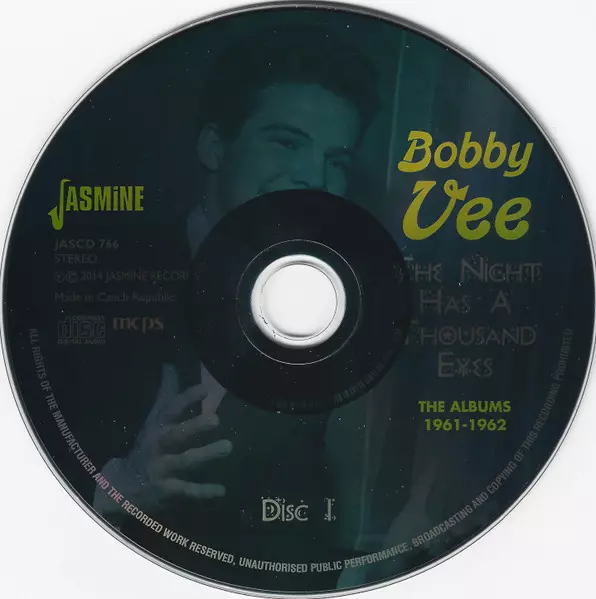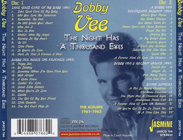 Bobby Vee: The Night Has A Thousand Eyes (The Albums 1961-1962) versión en 2CD en estándar edición. Esta edición en concreto se lanzó en Reino Unido en la editorial Jasmine Records el día 29. abril 2014. Álbum abarca todos los géneros Rock, Pop y Classic Rock.