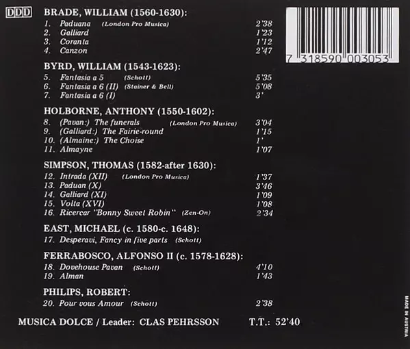 | Artista | William Byrd | Alfonso Ferrabosco | Clas Pehrsson | Anthony Holborne | William Brade | Thomas Simpson | Musica Dolce | Michael East | Robert Philips |
