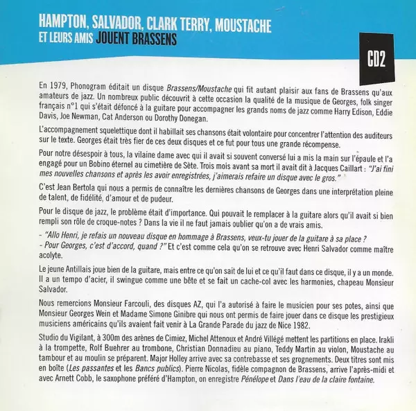 Clark Terry: Georges Brassens & Le Jazz versión en 2CD en estándar edición. Esta edición en concreto se lanzó en Francia en la editorial Universal Music en colaboración con Mercury France y Universal Music Classics & Jazz France el día 14. marzo 2011. Álbum abarca todos los géneros Pop y Jazz.