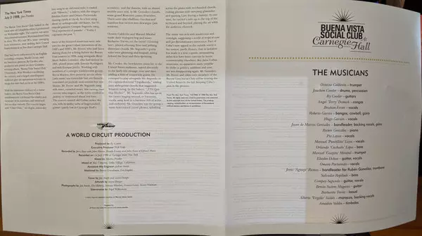 Buena Vista Social Club, album World Circuit / Nonesuch Records z roku 1997, oceněné cenou Grammy, které produkoval Ry Cooder, je nejprodávanějším albem world music vůbec, do dnešního dne se prodalo více než osm milionů nosičů. Kubánští hudebníci z tohoto alba odehráli 1. července 1998 vyprodaný koncert v newyorské Carnegie Hall, který byl určen pouze pro jeden večer. Toto vystoupení se stalo vrcholem slavného dokumentu Wima Wenderse z roku 1999 o těchto hudebnících, který se rovněž jmenuje Buena Vista Social Club.