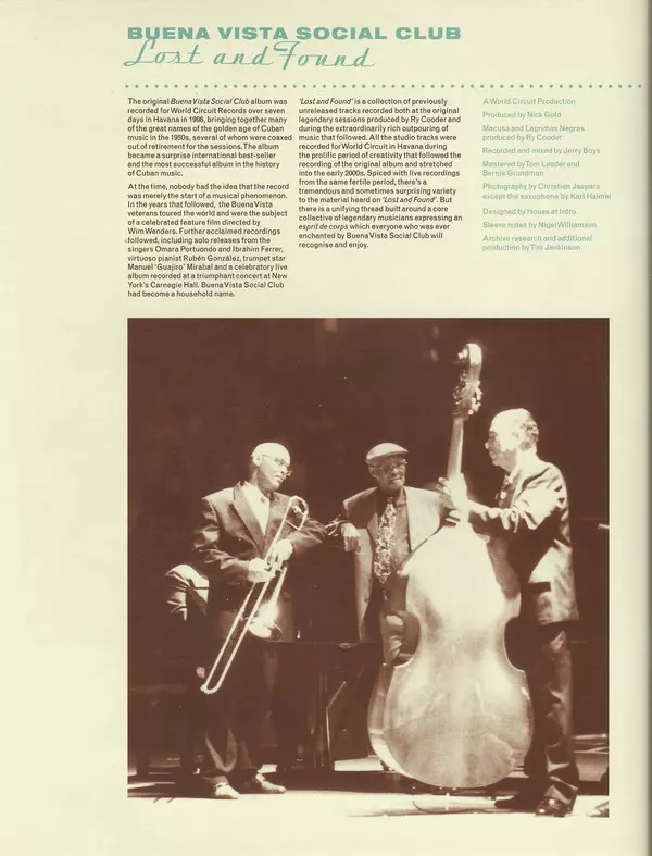 It was seven days in Havana Buena Vista Social Club's debut album, also called "Buena Vista Social Club", was recorded in 1996. The seven-day recording session with Ry Cooder and Nick Gold at EGREM studios in Havana is now legendary. Over the years, the album has become the most successful Cuban music album and the best selling world music album ever. Already during the recording of the album and some of the subsequent concerts, director Wim Wenders began filming a documentary, also called "Buena Vista Social Club". The film and the big world tour were extremely successful and Buena Vista Social Club made new friends all over the world with its music from pre-revolutionary Cuba - "Son Cubano". Since then, all involved have been repeatedly asked if there is still unpublished material in the archive. And just such material is now available on the new album "Lost And Found". As the title suggests, the recordings were probably lost in the archives. The fourteen new tracks come in part from the aforementioned recording sessions, but also included are live recordings from immediately after the release of the debut album. "Lost And Found" offers another opportunity to hear the line-up from the original studio recordings. They include Cachaíto López, Guajiro Mirabal, Eliades Ochoa, Omara Portuondo and the now sadly departed Buena Vista Social Club members Ibrahim Ferrer, Rubén González and Compay Segundo. The veterans are complemented by younger members who also support the Orquesta Buena Vista Social Club on tour. The songs are described as the musicians' favorite recordings and "Lágrimas Negras" is still one of the most popular Cuban songs. The sound is a seamless follow-up to the debut. In addition to piano, guitars, trombone and bass, laud and congas reappear in the arrangement. Buena Vista Social Club invites you to dance to rhythms from rumba to salsa. On the album "Lost And Found", Buena Vista Social Club presents real treasures from the archives. Finally, unreleased material from the debut album will also be performed. Review. We bow. The sound: three-dimensional, spatial - beautiful!" (Audio, April 2015)