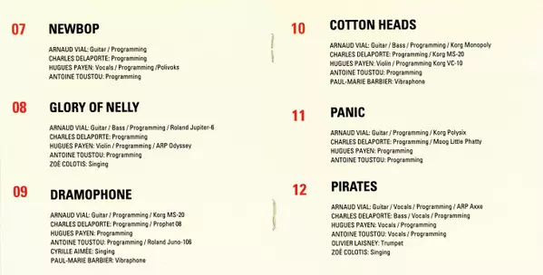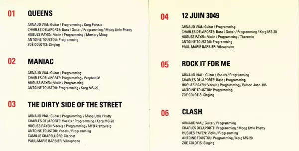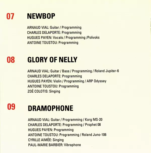 Guitar, Bass [Programming, Korg Monopoly] Arnaud Vial | Programmed By [Programming, Korg Ms-20] Charles Delaporte | Programmed By [Programming] Antoine Toustou | Vibraphone Paul-Marie Barbier | Violin [Programming, Korg Vc-10] Hugues Payen