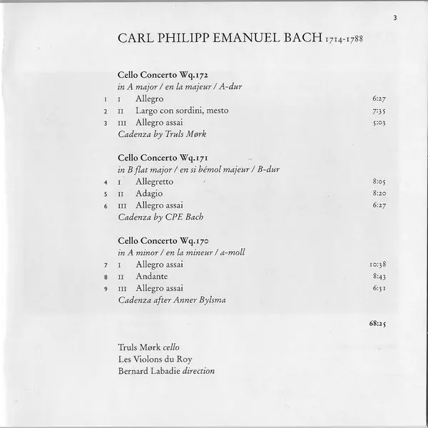 | Artista | Carl Philipp Emanuel Bach | Truls Mørk | Les Violons du Roy | Bernard Labadie |