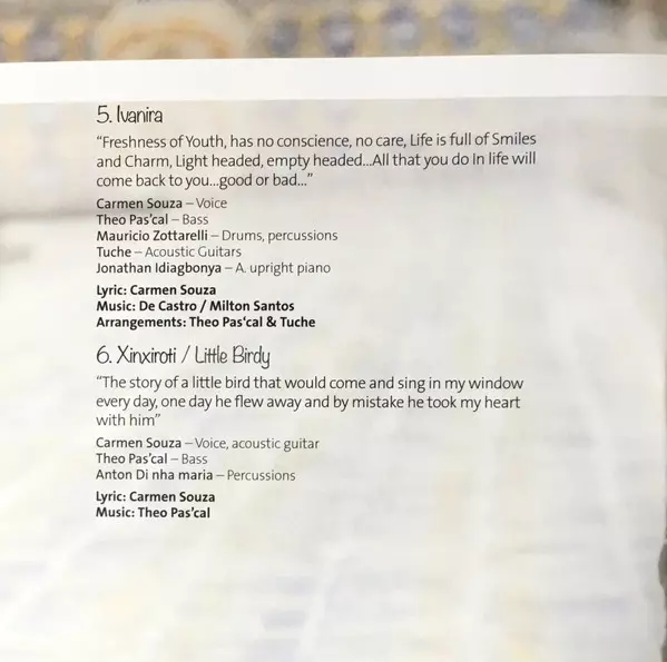 Acoustic Guitar Tuche | Bass, Double Bass, Percussion Theo Pas'cal | Drums Mauricio Zottarelli | Lyrics By, Music By Carmen Souza | Voice Carmen Souza