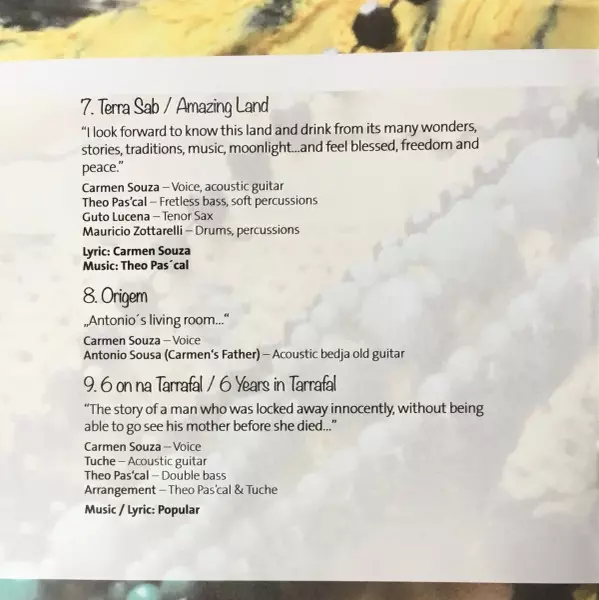 Bass, Percussion Theo Pas'cal | Drums Mauricio Zottarelli | Lyrics By Carmen Souza | Music By Theo Pas'cal | Tenor Saxophone Guto Lucena | Voice, Acoustic Guitar Carmen Souza