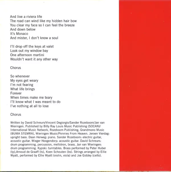 Arranged By [Brass] David Schreurs | Brass [Bs] Koen Schouten (2) | Brass [Tp] Peter Huber (2) | Brass [Ts] Arnoud de Graaff | Clarinet Jonathan Bittman | Drum Programming, Percussion, Upright Piano, Bass David Schreurs, Jan van Wieringen | Effects [Sound Fx] Robin Veldman | Electric Guitar Wieger Hoogendorp | Grand Piano Daan Herweg | Turntables Kypski | Written-By David Schreurs, Jan van Wieringen, Vincent Degiorgio