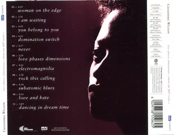 Cassandra Wilson: Love Phases Dimensions (:: From The JMT Years ::) versión en CD en estándar edición. Esta edición en concreto se lanzó en Europa en la editorial Edel Records el día 14. enero 2022. Álbum abarca todos los géneros Jazz y Contemporary Jazz.