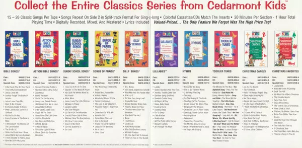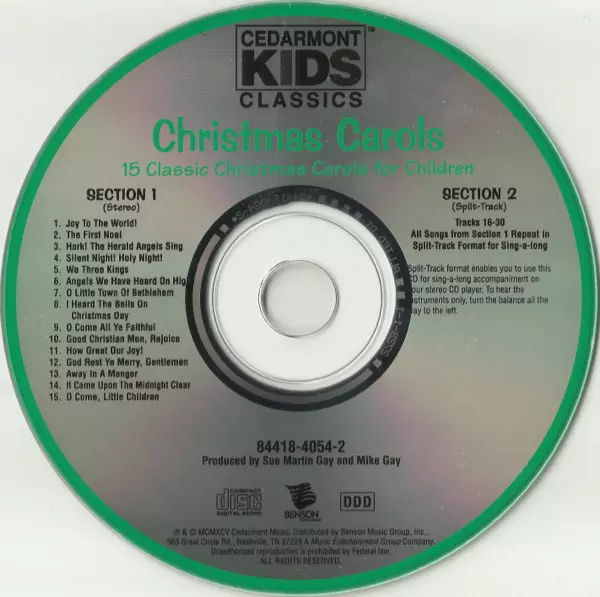 Cedarmont Kids: Christmas Carols versión en CD en estándar edición. Esta edición en concreto se lanzó en EE.UU. en la editorial Cedarmont Music en colaboración con Benson Music Group el día 14. noviembre 2000. Álbum abarca todos los géneros Pop, Folk, World, & Country, Para niños, Folk y Holiday.