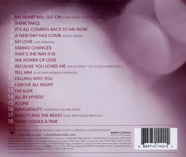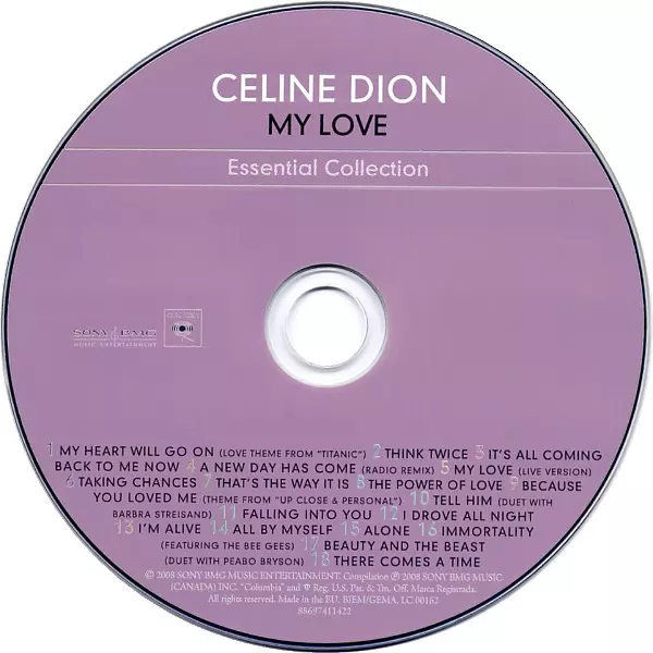 Céline Dion: My Love (The Essential Collection) versión en CD en estándar edición. Esta edición en concreto se lanzó en Reino Unido en la editorial Columbia en colaboración con Sony BMG Music Entertainment el día 14. enero 2019.