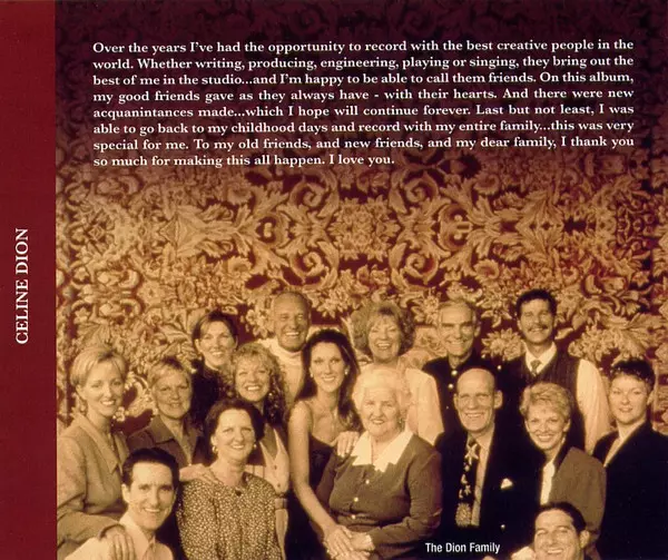 | Arranged By Peter Zizzo, Ric Wake | Arranged By [Backing Vocals] Loris Holland | Arranged By [Orchestra] Rob Mathes | Backing Vocals Ayana George, Cindy Mizelle, Dennis Collins, Diva Gray, Elizabeth Withers, Fonzi Thornton, Latasha Jordan, Loris Holland, Nancey Jackson, Paulette McWilliams, Spencer Washington, Troy Bright, Vaneese Thomas | Conductor Rob Mathes | Drum Programming Jimmy Bralower, Peter Zizzo | Guitar Larry Saltzman, Marc Shulman, Peter Zizzo | Mixed By Humberto Gatica | Organ Loris Holland | Producer Ric Wake | Programmed By [Bass] Peter Zizzo | Programmed By [Keyboards] Peter Zizzo | Programmed By [Synths] Jeff Bova | Written-By Céline Dion, Peter Zizzo, Ric Wake | |||