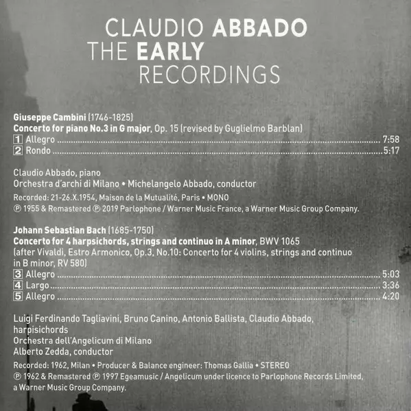 | Composed By Giovanni Giuseppe Cambini | Conductor Michelangelo Abbado | Orchestra Orchestra D'Archi Di Milano | Piano Claudio Abbado | ||