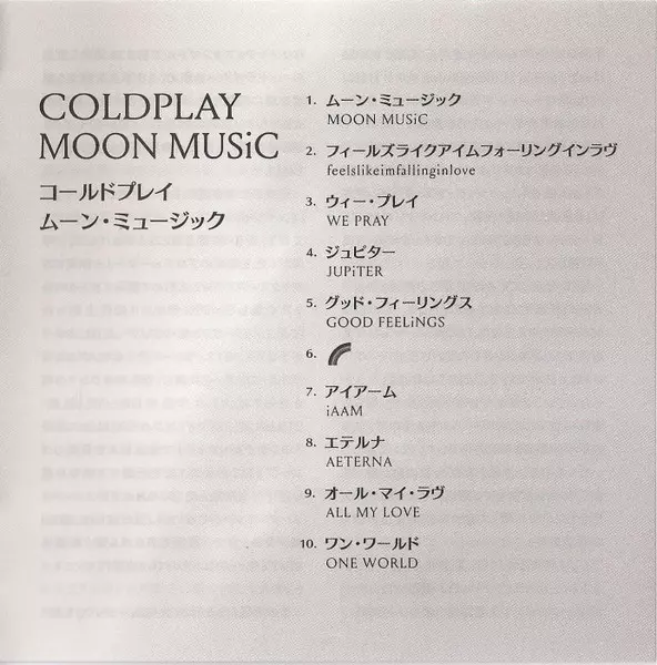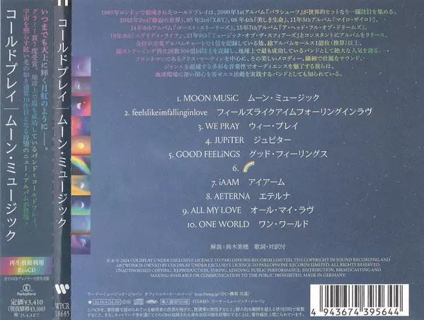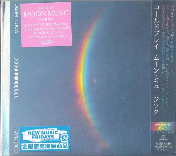 Coldplay: Moon Music LTD versión en CD en de edición limitada edición. Esta edición en concreto se lanzó en Japón en la editorial Parlophone el día 4. octubre 2024. Álbum abarca todos los géneros Rock, Pop, Música electrónica, Pop Rock, Synth-Pop y Alt-Pop.