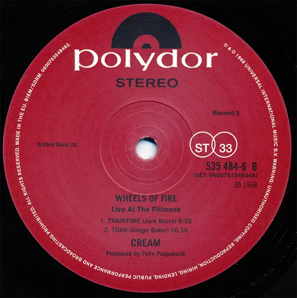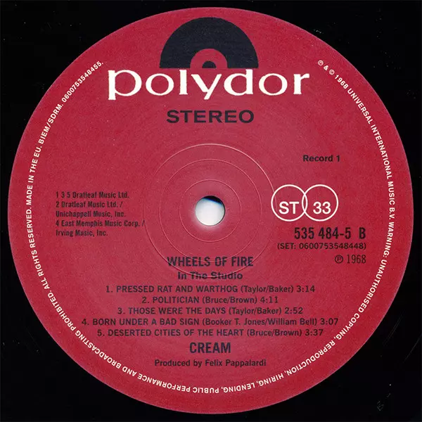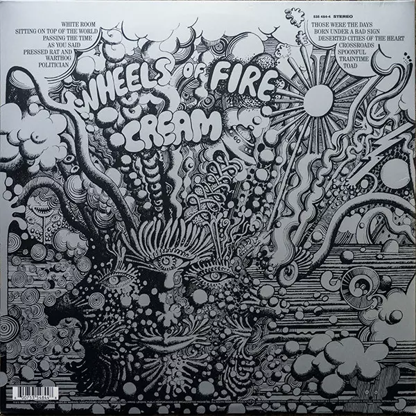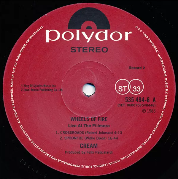 Four months before the Beatles submitted their nomination for the best double album of 1968, Cream submitted their nomination. Wheels Of Fire, a record that featured the classic track "White Room" and other great performances by the rock trio, appeared in British record stores on August 9, 1968 and became a real curiosity. But in terms of sales, Cream was on a roll. In the first example of what we now call a multi-format release, Polydor issued both a single disc of In The Studio, which contained the tracks "White Room" and "Sitting On Top Of The World", "Politician" and "Born Under A Bad Sign", and a double disc containing this set and a disc of Live At The Fillmore, recorded at three different concerts at this venue in 1968. Alongside a cover of Howlin' Wolf's "Sitting On Top Of The World", Cream paid tribute with bluesy versions of "Spoonful", another Wolf cover but written by Willie Dixon, and of course Robert Johnson's epic "Crossroads". Billboard chart and four weeks later, on August 10, it reached the top of the US charts, knocking Herb Alpert & The Tijuana Brass' The Beat of the Brass off the top spot and starting a four-week streak at number one. In the UK, not one but two Cream albums appeared on the chart on 17 August. The single album climbed to No. 7 in its second week, while the double album eventually reached No. 3.