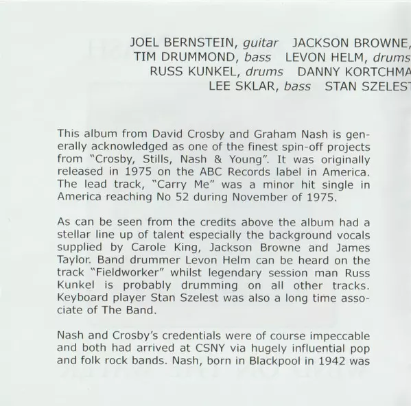Bass Tim Drummond | Drums Levon Helm | Electric Guitar David Crosby | Electric Piano Stan Szelest | Percussion Russ Kunkel | Piano [Acoustic Piano] Graham Nash | Slide Guitar [Electric Slide] Ben Keith, David Lindley | Words By, Music By Graham Nash