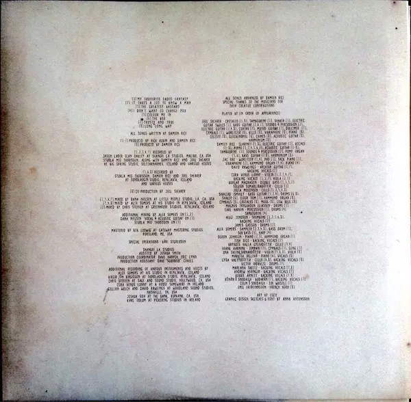 Backing Vocals Tina Dickow | Bass Guitar Shahzad Ismaily | Bass Guitar, Sounds, Percussion, Electric Guitar, Recorded By Joel Shearer | Cello Júlía Mogensen | Drums James Gadson | Mixed By Chris Steffen | Piano Deron Johnson | Piano, Sounds, Percussion, Producer, Recorded By Damien Rice | Producer Rick Rubin | Recorded By Sean Oakley, Sturla Þórisson | Sampler, Mixed By [Additional Mixing] Alex Somers | Trombone, Backing Vocals Helgi Hrafn Jónsson | Vibraphone Zac Rae | Violin, Backing Vocals, Viola Cora Venus Lunny