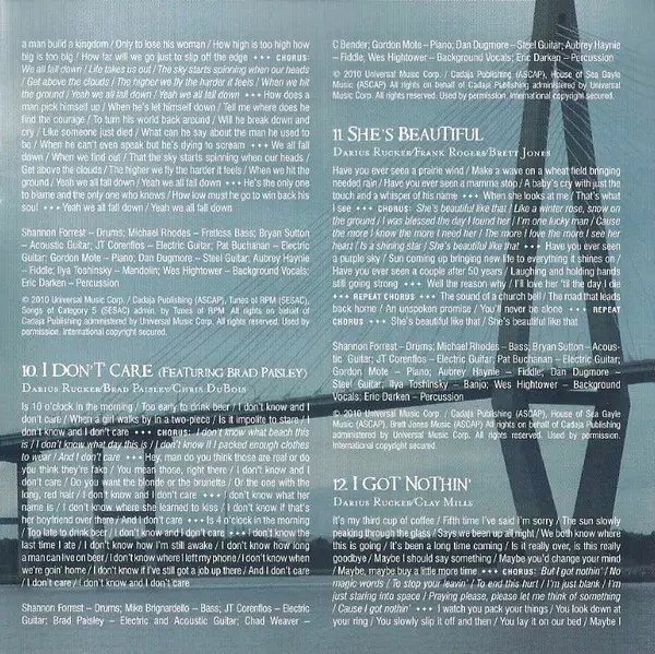 Acoustic Guitar, Mandolin Bryan Sutton | Backing Vocals Wes Hightower | Banjo Ilya Toshinsky | Bass Michael Rhodes | Drums Shannon Forrest | Electric Guitar JT Corenflos, Pat Buchanan | Fiddle Aubrey Haynie | Percussion Eric Darken | Piano Gordon Mote | Steel Guitar Dan Dugmore | Written-By Darius Rucker, Frank Rogers, Kara DioGuardi